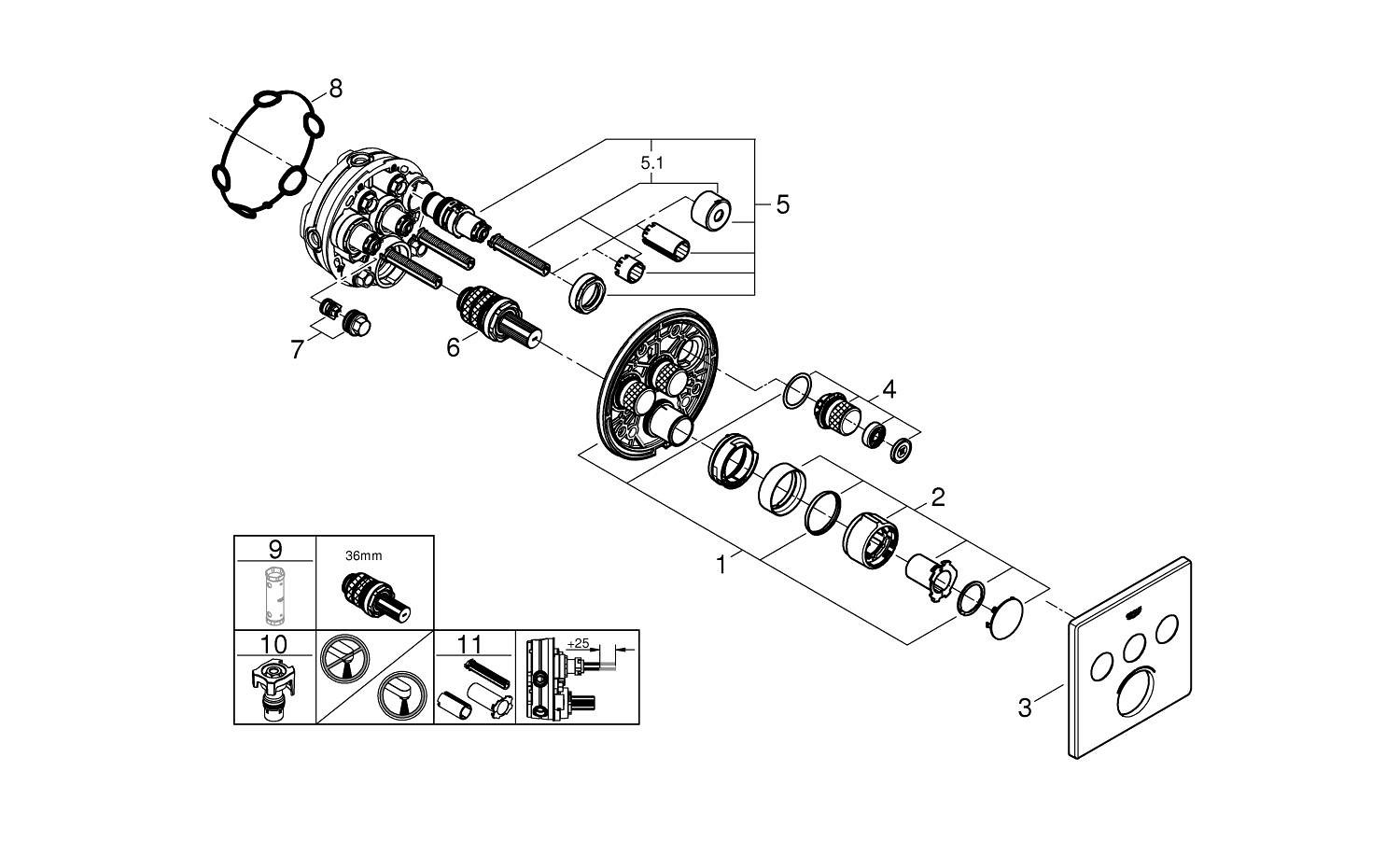 Afbouwdeel SMARTCONTROL met 3x omstel glas vierkant Grohe