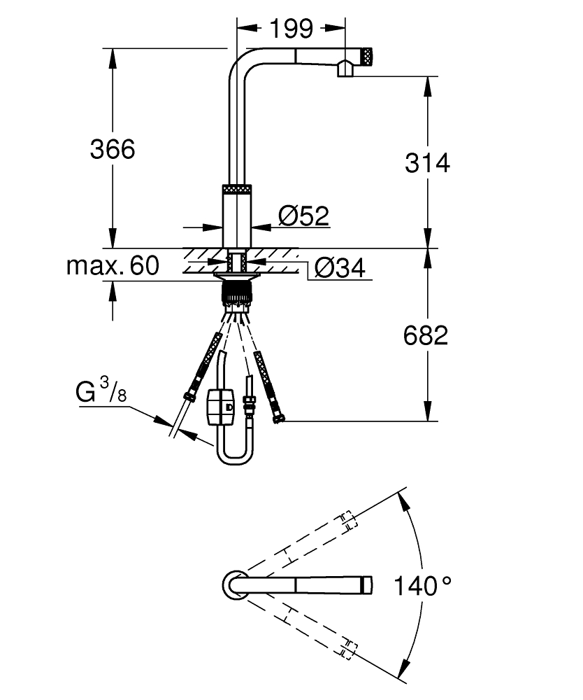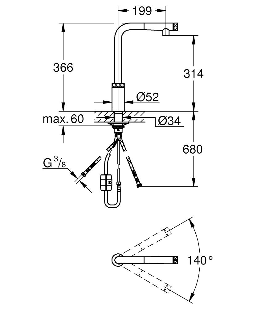 - Opbouwhoogte onderkant kraanmondstuk: 314 mm
