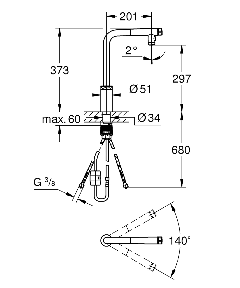 - Opbouwhoogte onderkant kraanmondstuk: 297 mm