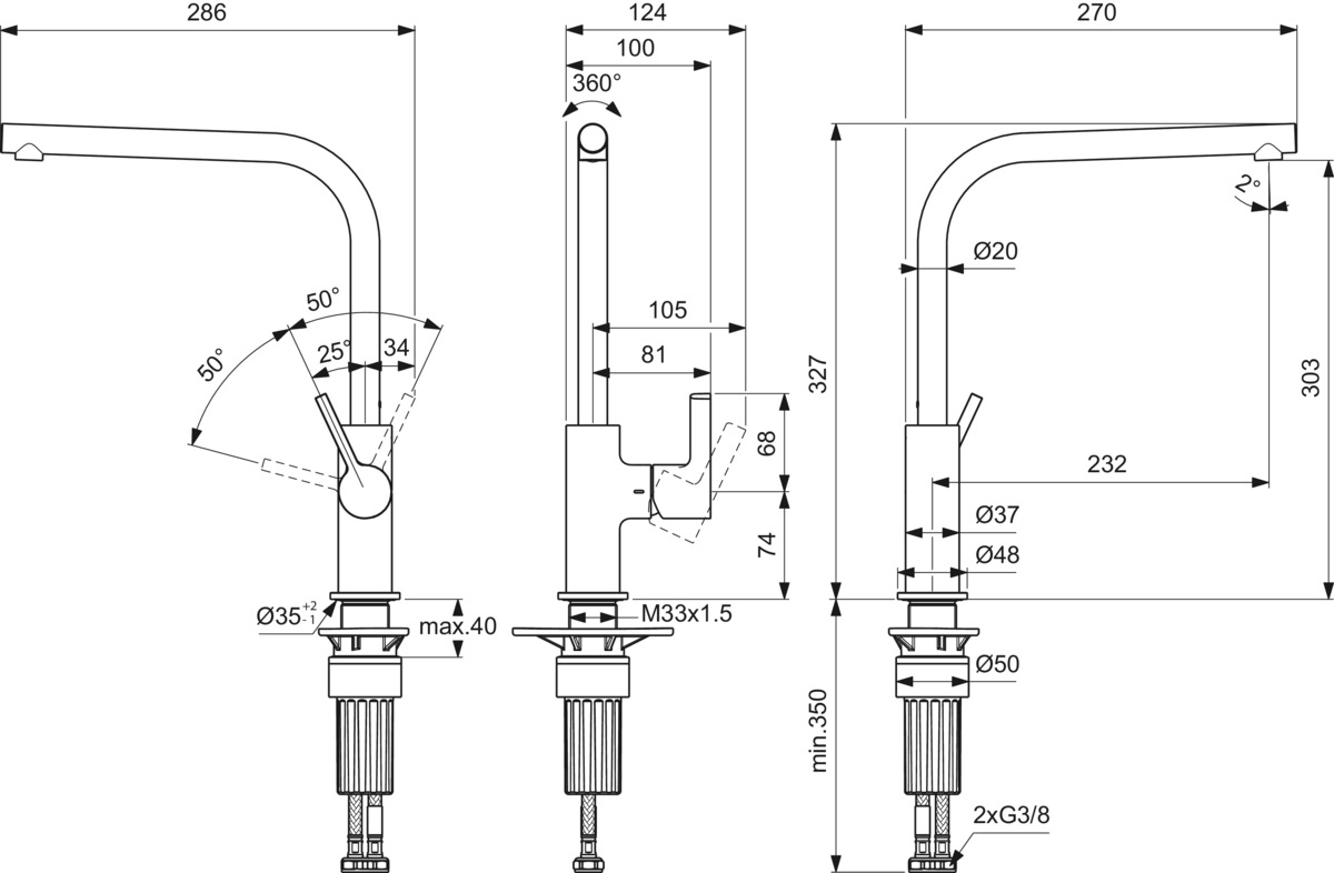 - Opbouwhoogte onderkant kraanmondstuk: 303 mm