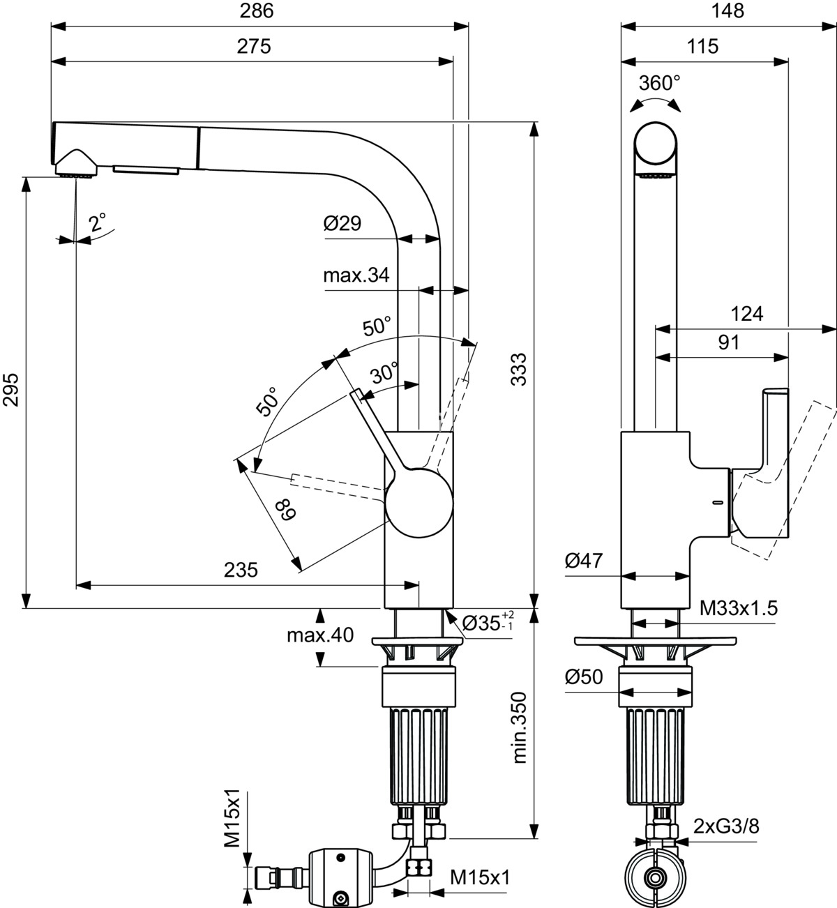 - Opbouwhoogte onderkant kraanmondstuk: 295 mm