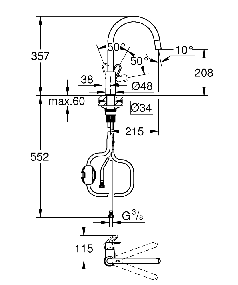 - Opbouwhoogte onderkant kraanmondstuk: 208 mm