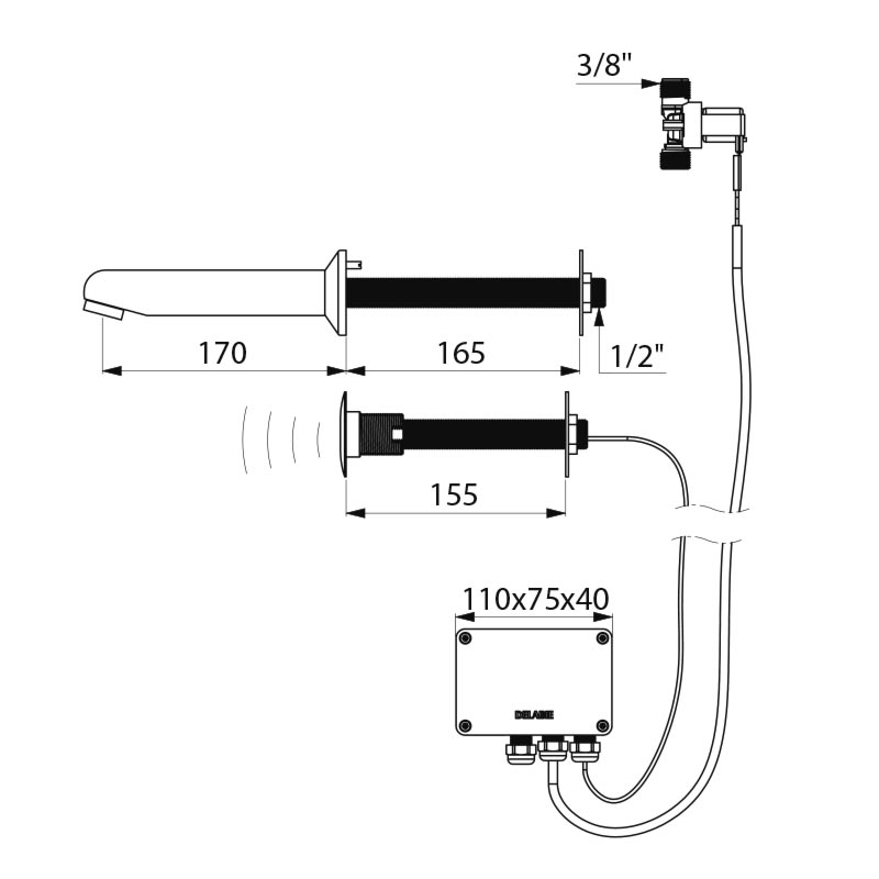 Wandkraan elektronisch m. losse sensor + trafo l=170mm Delabie