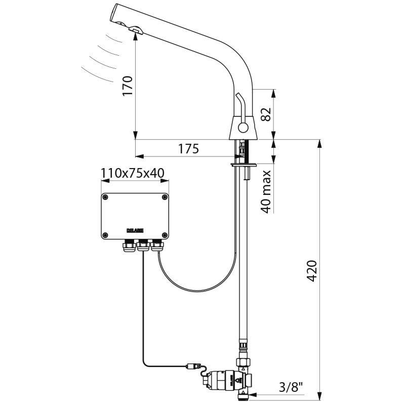 Wastafel mengkraan M3/8" H.170mm op batterijen 6V Delabie