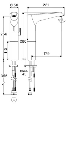 - Opbouwhoogte onderkant kraanmondstuk: 255 mm