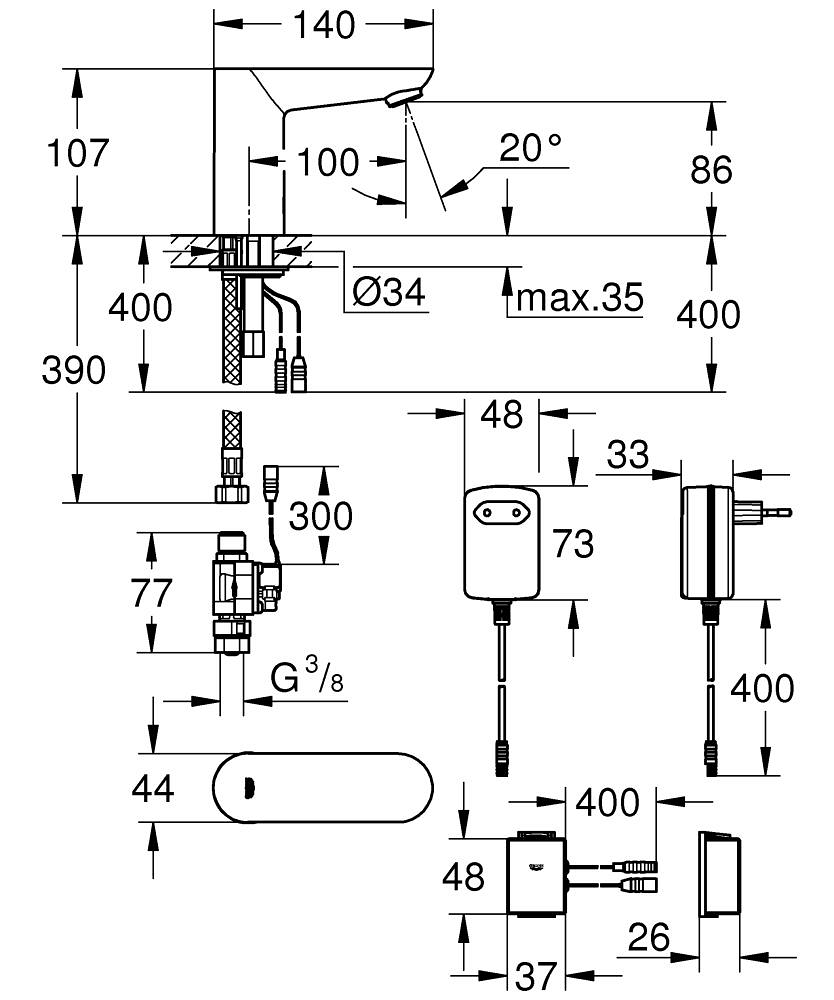 - Opbouwhoogte onderkant kraanmondstuk: 86 mm