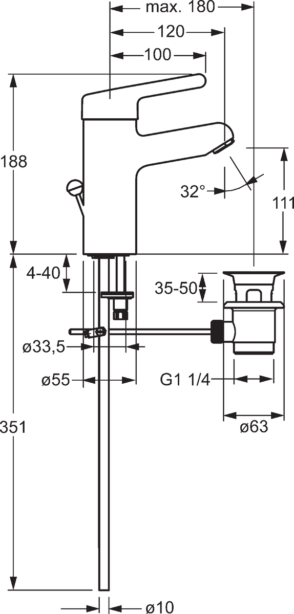 - Type afvoeraansluiting: Pop-up plug met verticale hefboom
