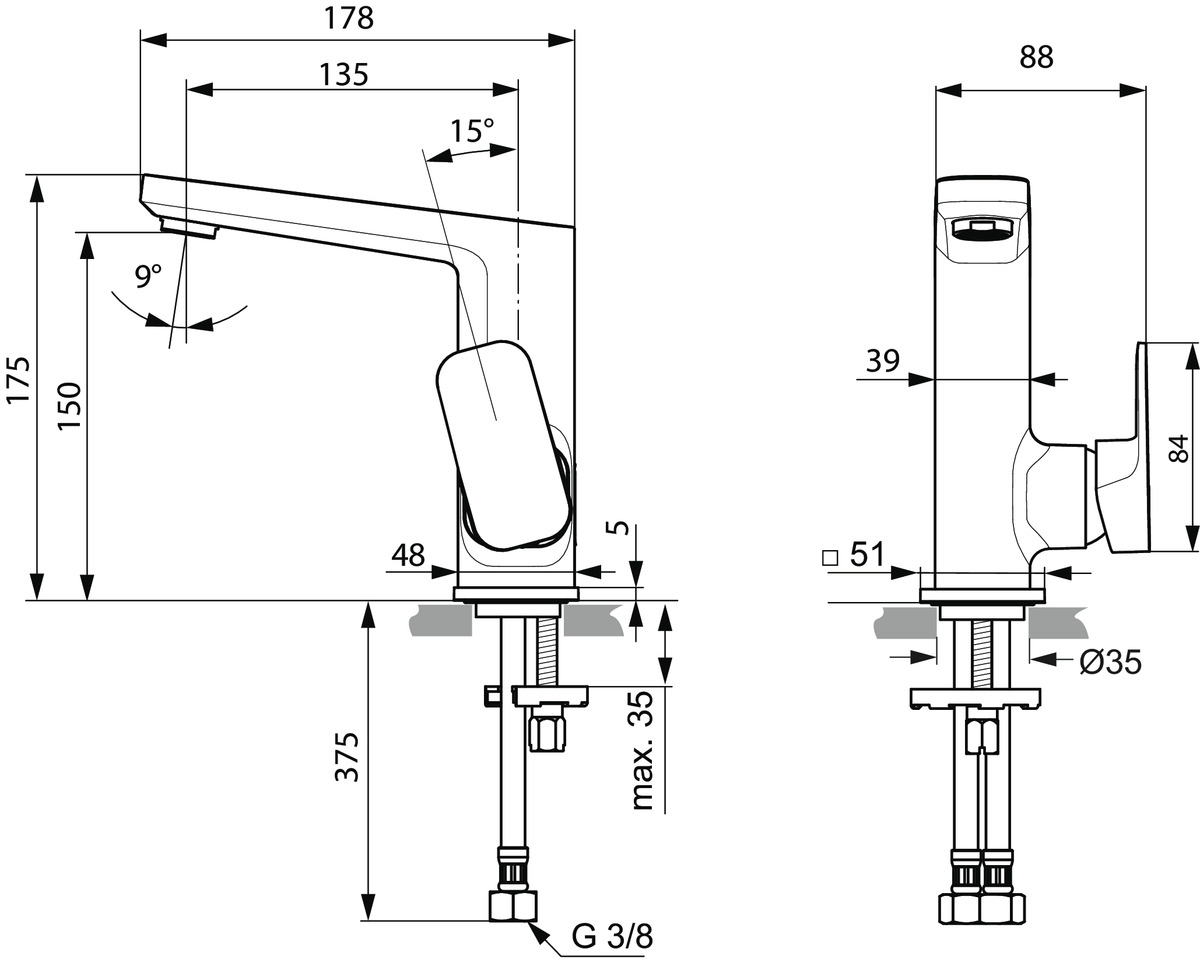- Opbouwhoogte onderkant kraanmondstuk: 150 mm