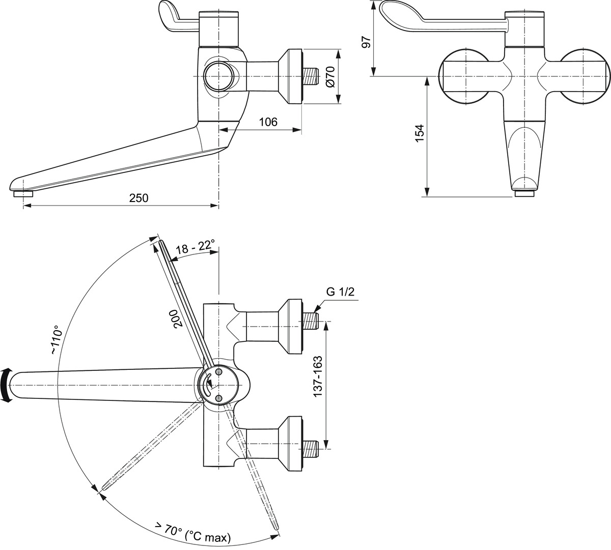 Ceraplus2 therm. wandmengkr.chroom /draaibare uitloop 250mm incl. afsl.s-koppeling Ideal Standard