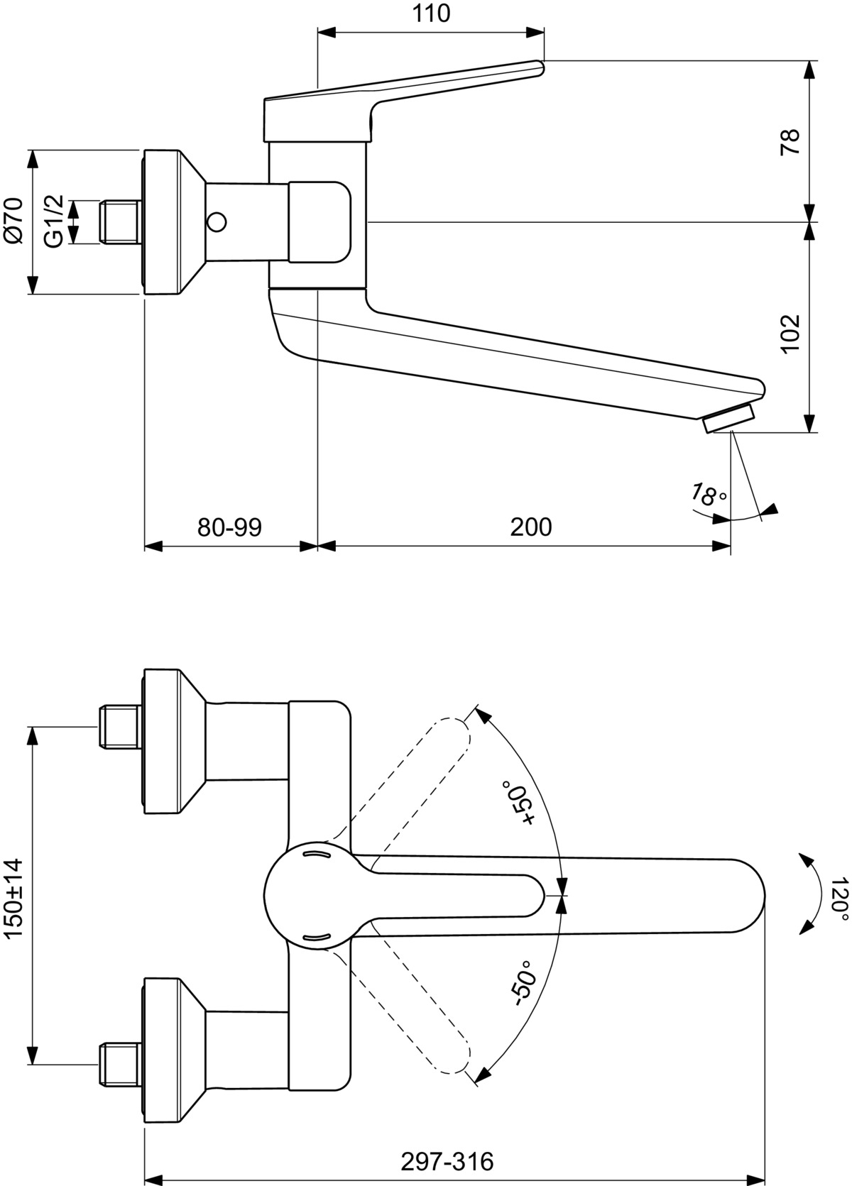 Ceraplus 2 wandmengkraan chroom draaibare uitloop 200mm incl. afsluitbare s-koppeling Ideal Standard