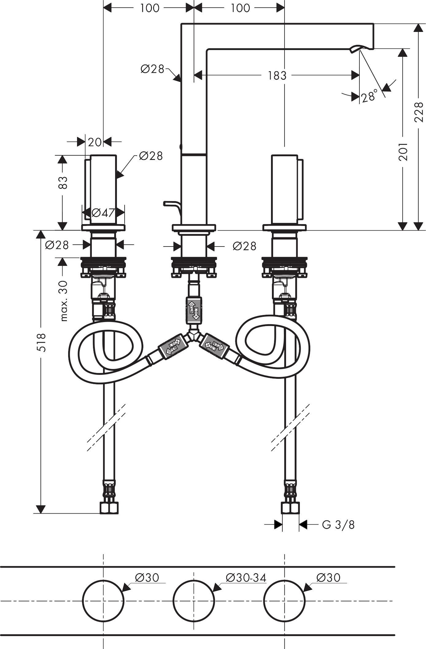 - Opbouwhoogte onderkant kraanmondstuk: 200 mm