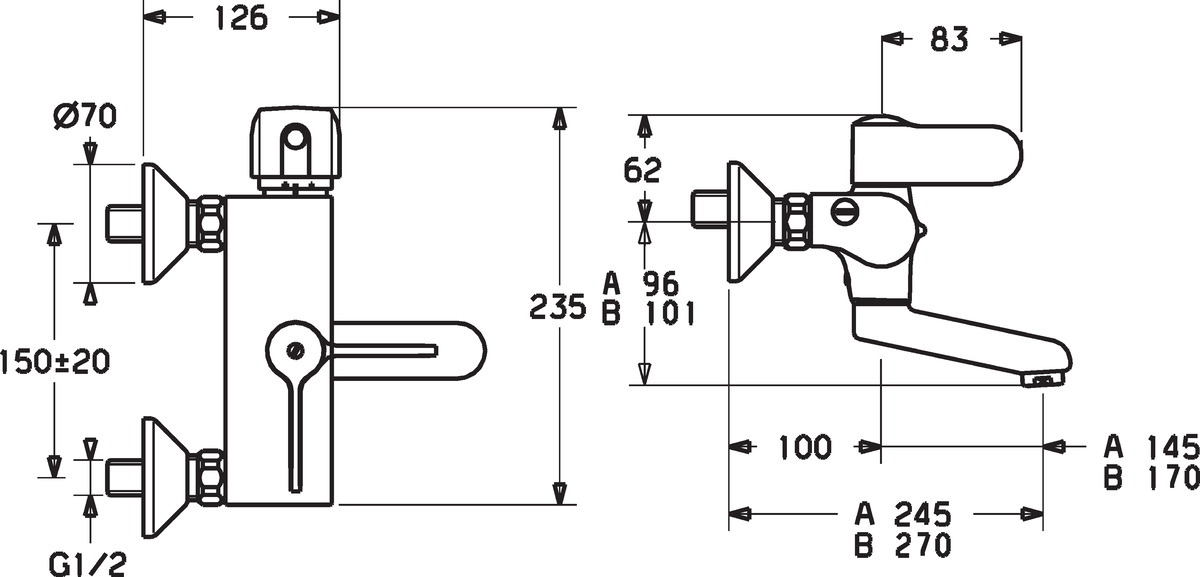HANSATEMPRA thermostaat 120° draaibare uitloop lange hendel, HOH 150mm, incl. afsluitbare S-koppelingen 1/2"x3/4" HANSA