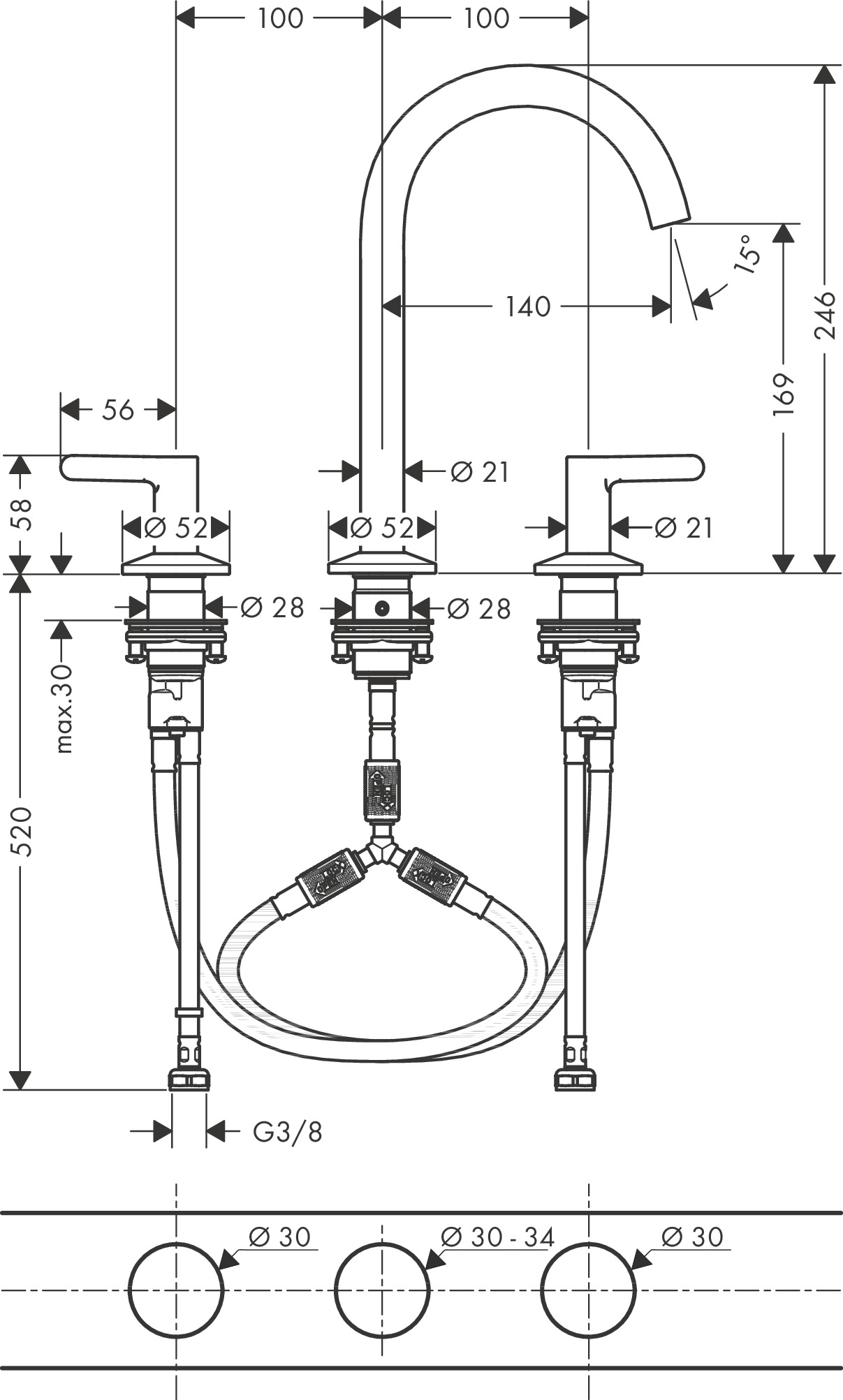 - Opbouwhoogte onderkant kraanmondstuk: 170 mm