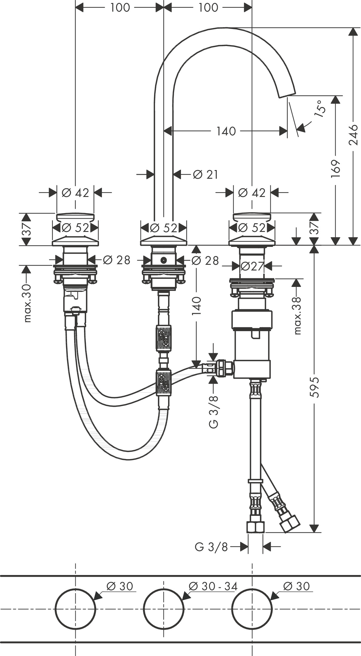 - Opbouwhoogte onderkant kraanmondstuk: 170 mm