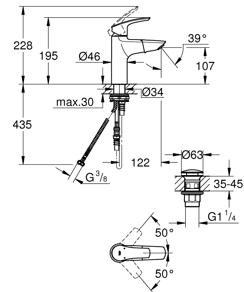 - Opbouwhoogte onderkant kraanmondstuk: 107 mm