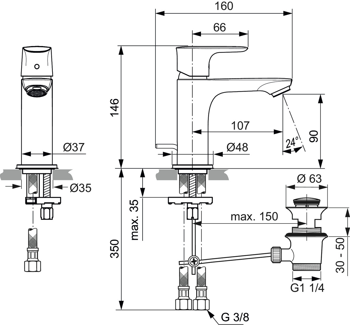 - Diameter boorgat kraan: 35 mm
