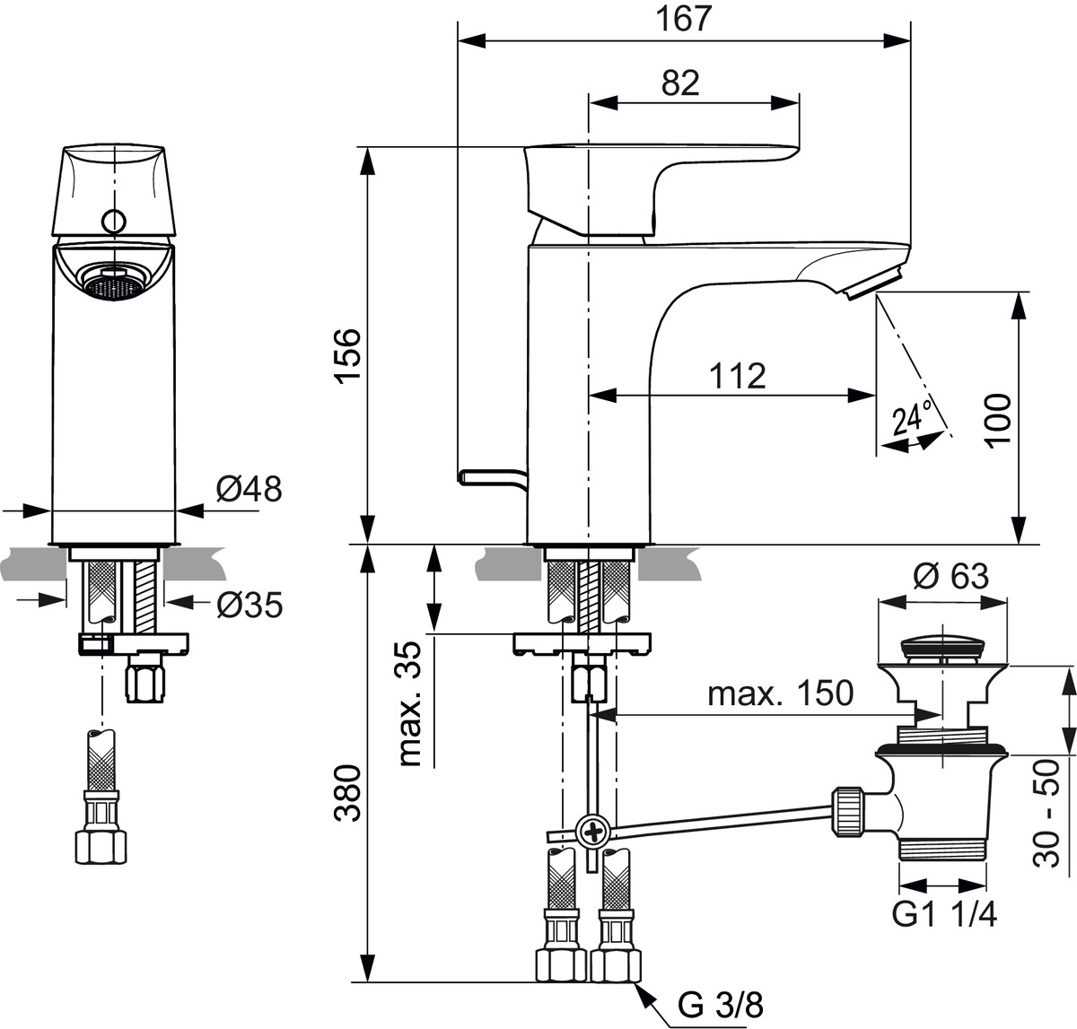 - Opbouwhoogte onderkant kraanmondstuk: 100 mm