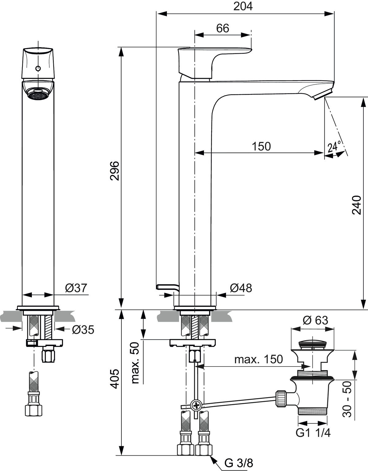 - Opbouwhoogte onderkant kraanmondstuk: 240 mm