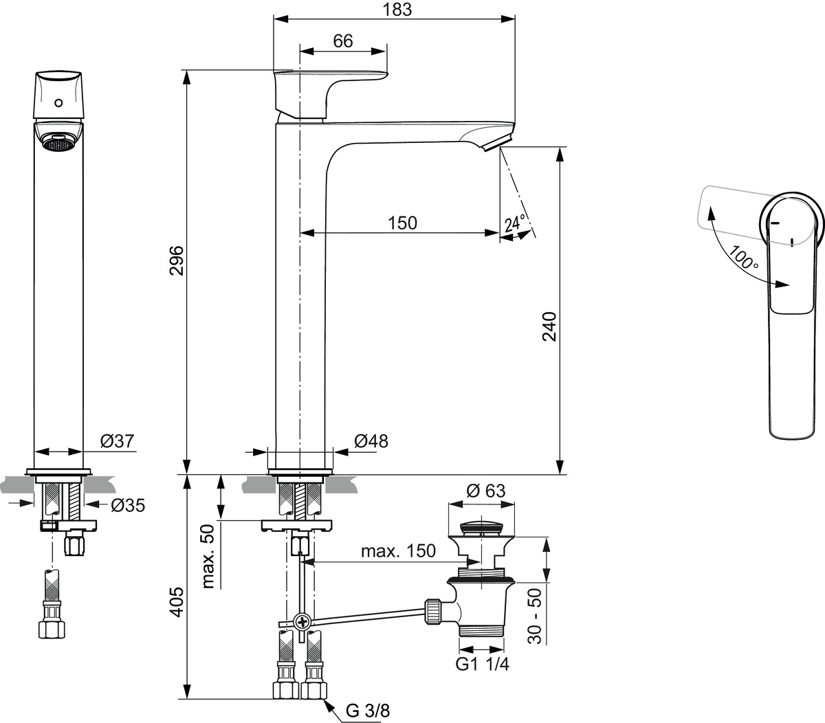 - Opbouwhoogte onderkant kraanmondstuk: 240 mm
