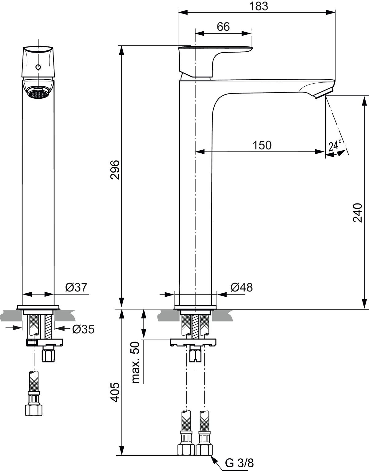 - Opbouwhoogte onderkant kraanmondstuk: 240 mm