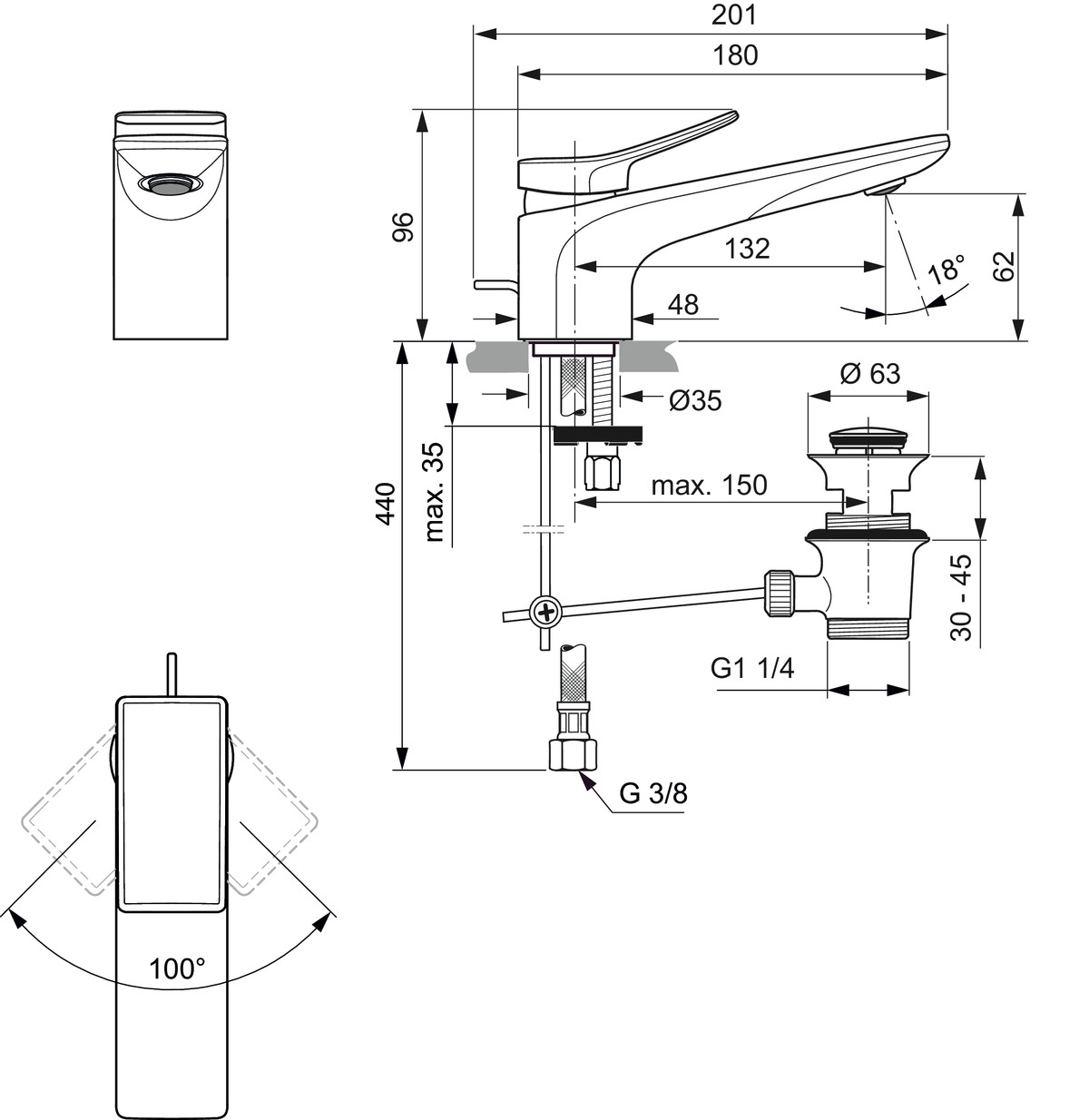 - Opbouwhoogte onderkant kraanmondstuk: 62 mm