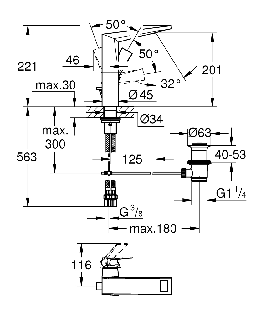 - Opbouwhoogte onderkant kraanmondstuk: 201 mm