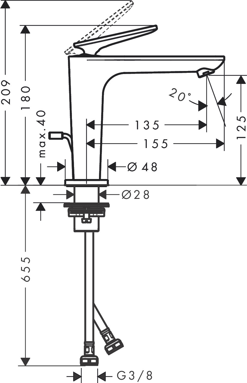 - Opbouwhoogte onderkant kraanmondstuk: 125 mm