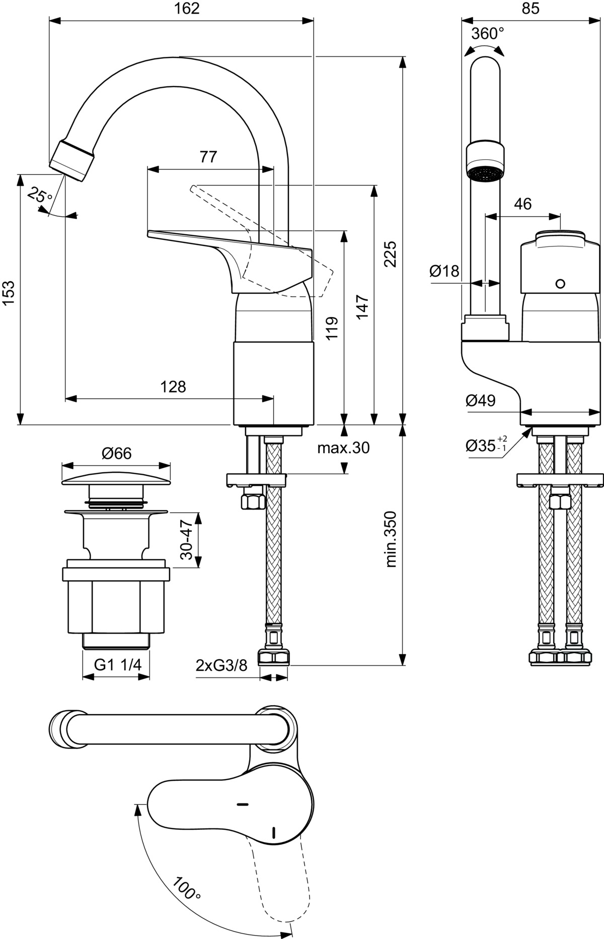 Wastafelmengkraan 85x162x225mm chroom 5l/min m. waste Cerabase Ideal Standard
