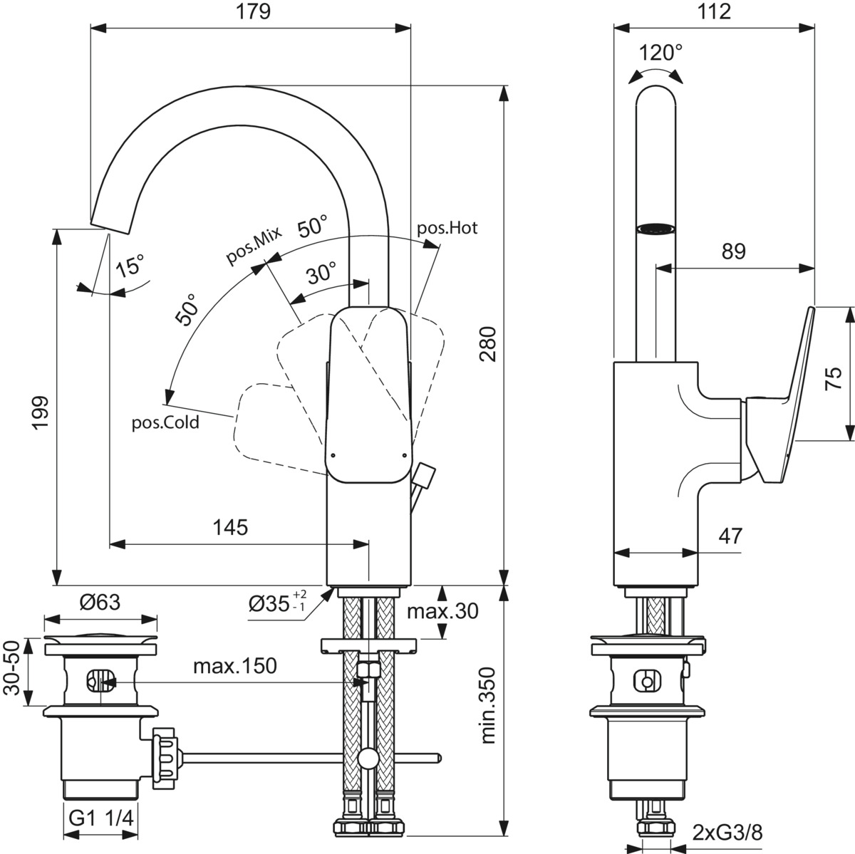 • Diameter boorgat kraan: 35 mm