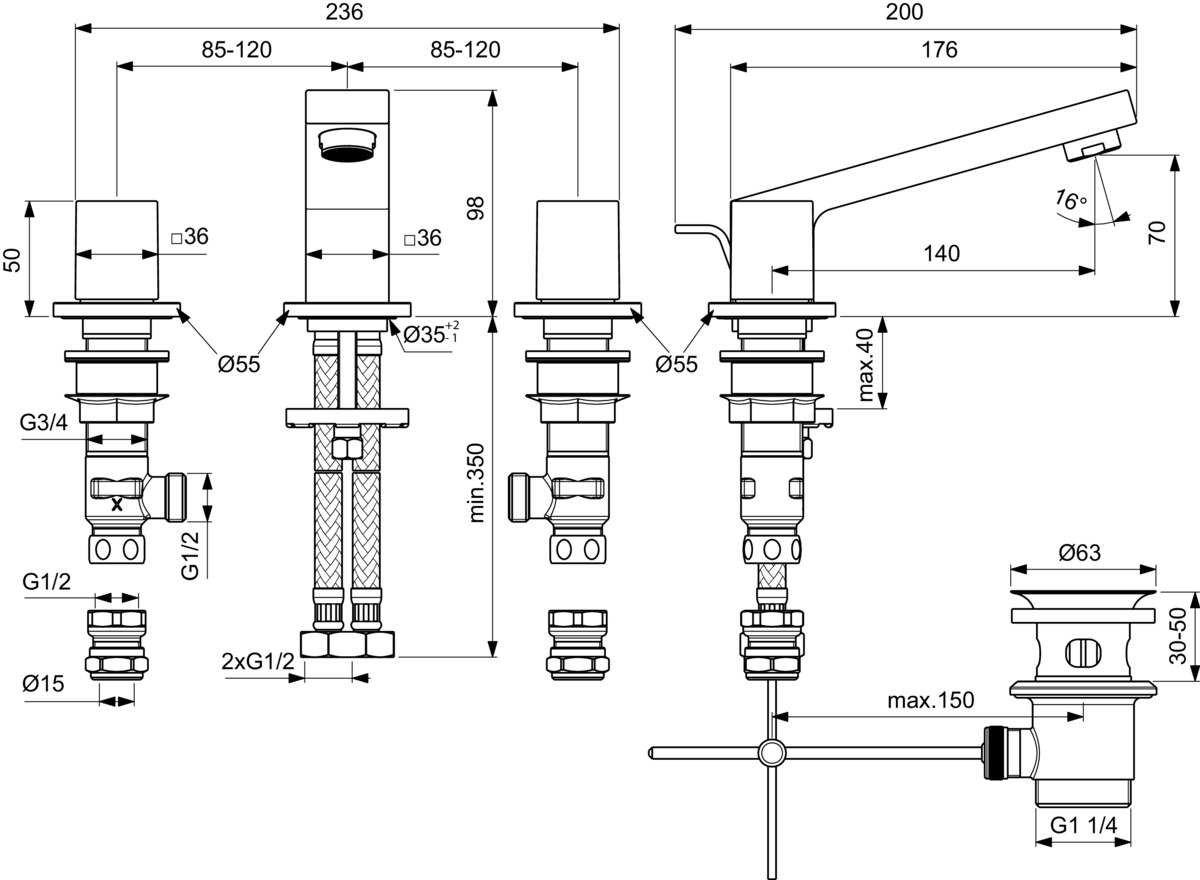 - Diameter boorgat kraan: 35 mm