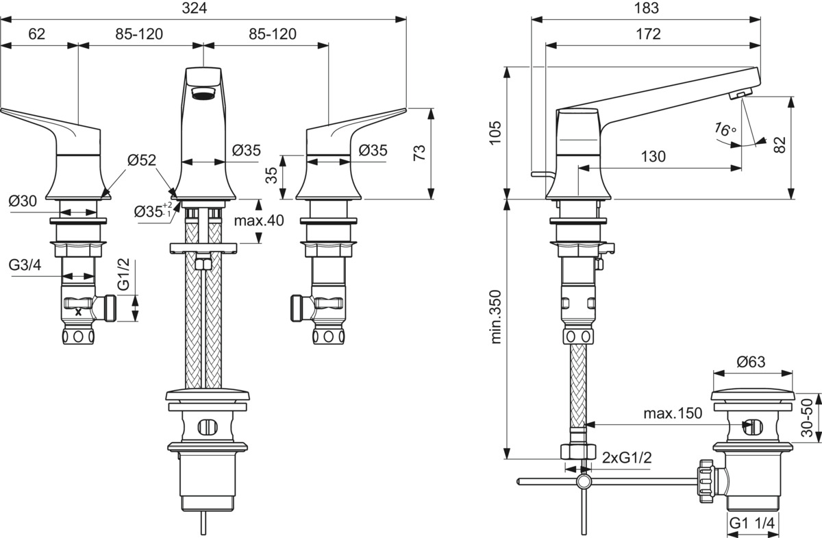 2-greeps wastafelkraan 324x183x105mm chroom 3.8l/m m. waste La Dolce Vita Ideal Standard