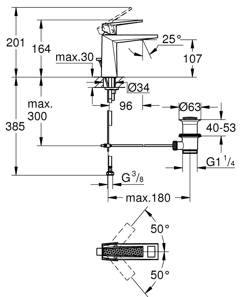 - Opbouwhoogte onderkant kraanmondstuk: 107 mm