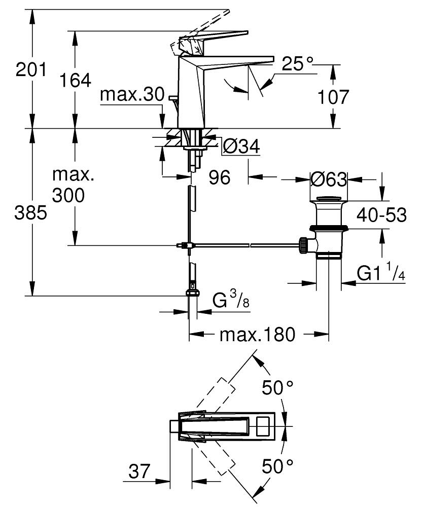 - Opbouwhoogte onderkant kraanmondstuk: 107 mm