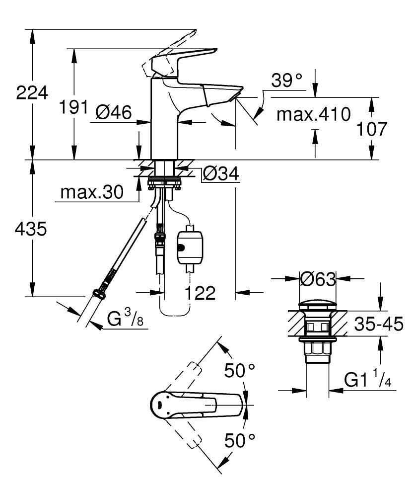 - Opbouwhoogte onderkant kraanmondstuk: 107 mm