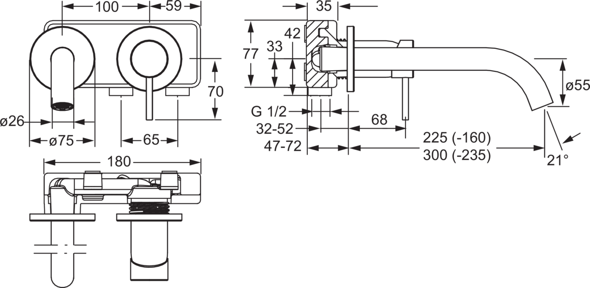 - Voorsprong uitloop: 225 mm
