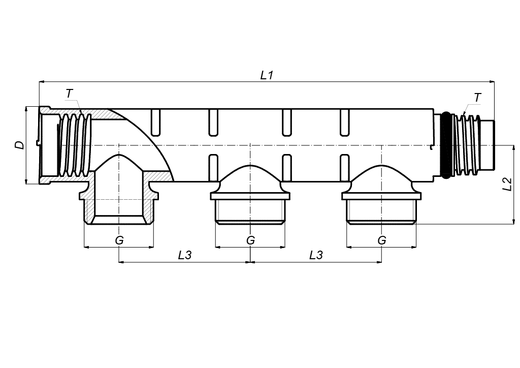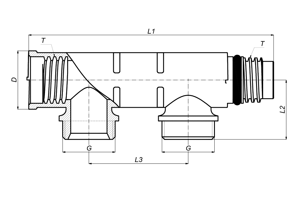 - Vorm: Verdeelstuk met rechte aftakkingen